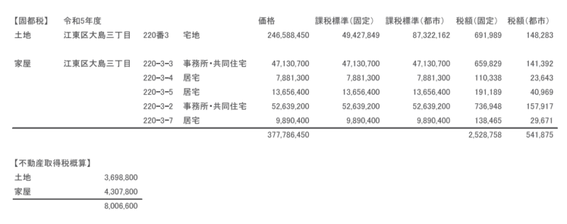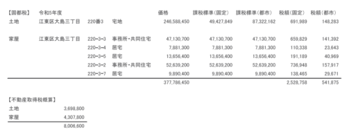 | 特記事項 | 令和5年度固都税評価額: 土地:246,000,000円 建物:131,000,000円 境界確定済み、確定測量済み 建物登記は5つの区分ですが、1棟全体が売買対象です。 | ||